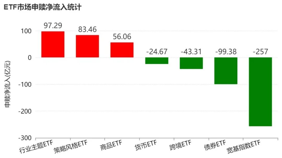 Wind数据显示,本周沪深两市股票型ETF和跨境型ETF合计净流出119.7亿元,宽基指数ETF净流出257亿元,行业主题ETF净流入97.3亿元。