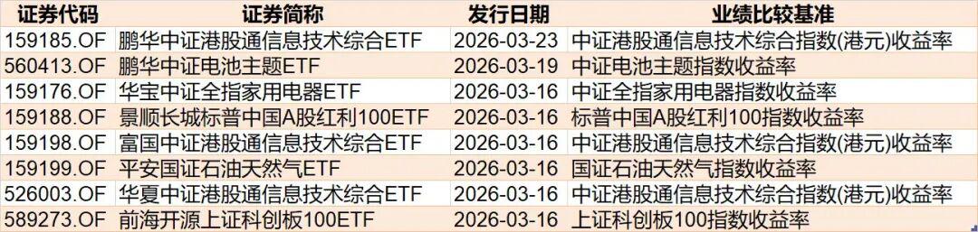 目前有7只ETF披露下周发行,跟踪标的为科创板100、石油天然气、港股通信息技术、家用电器、电池等。