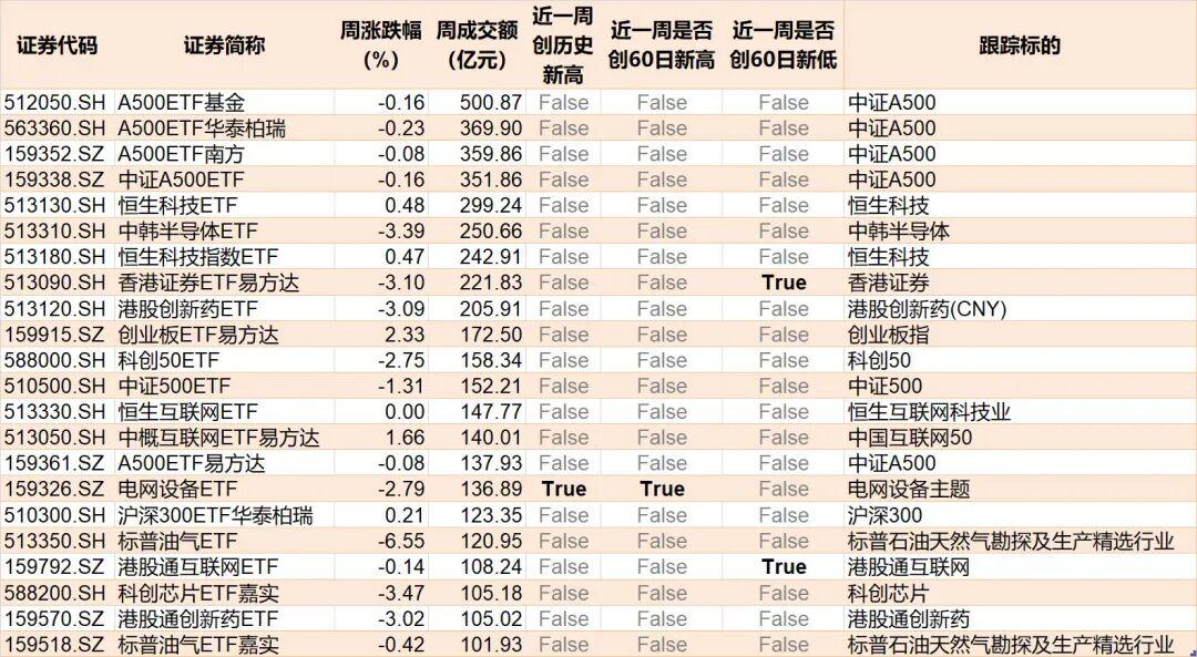 本周,股票型ETF和跨境型ETF成交额超100亿元的ETF有22只。其中,A500ETF基金周成交额超500亿元。