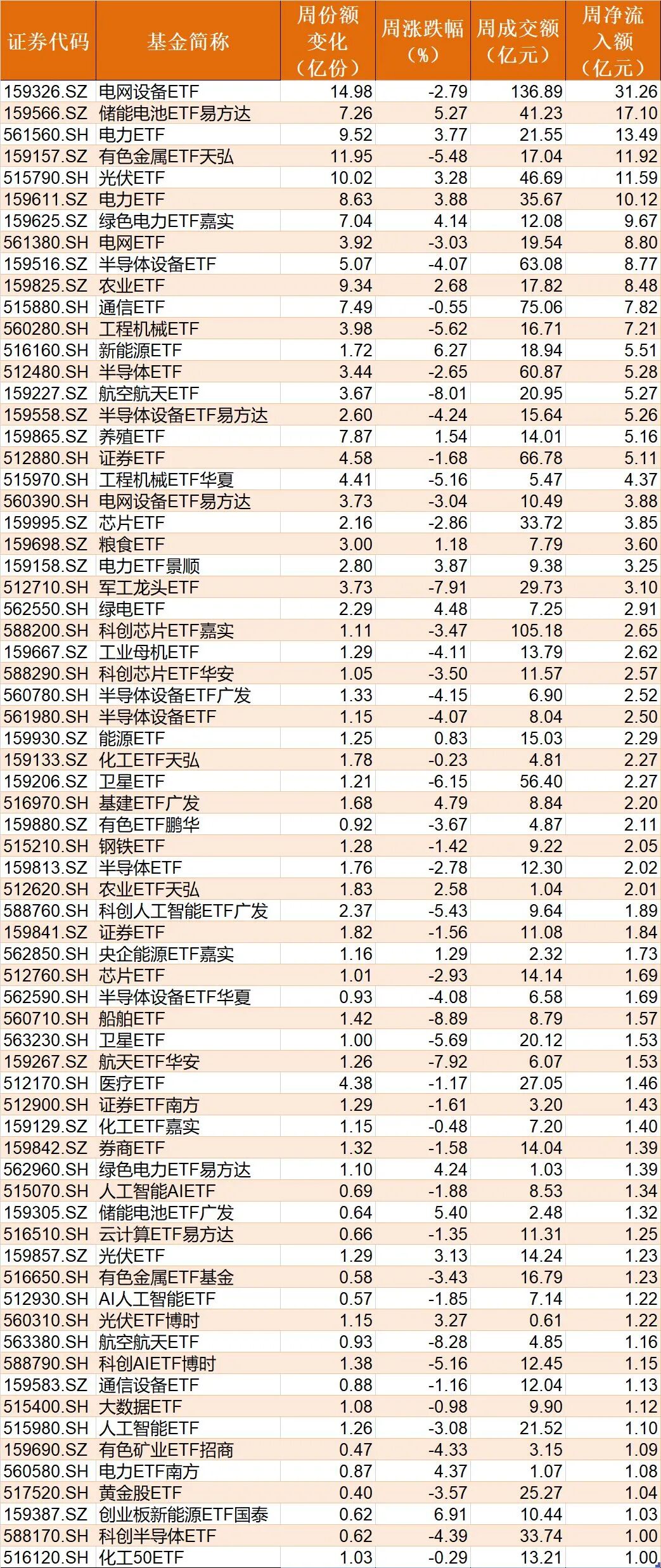 在行业主题ETF方面,本周净流入资金超1亿元的基金有69只,其中电网设备ETF、储能电池ETF易方达、电力ETF份额分别增加了14.98亿份、7.26亿份和9.52亿份,净流入资金31.26亿元、17.1亿元和13.49亿元。