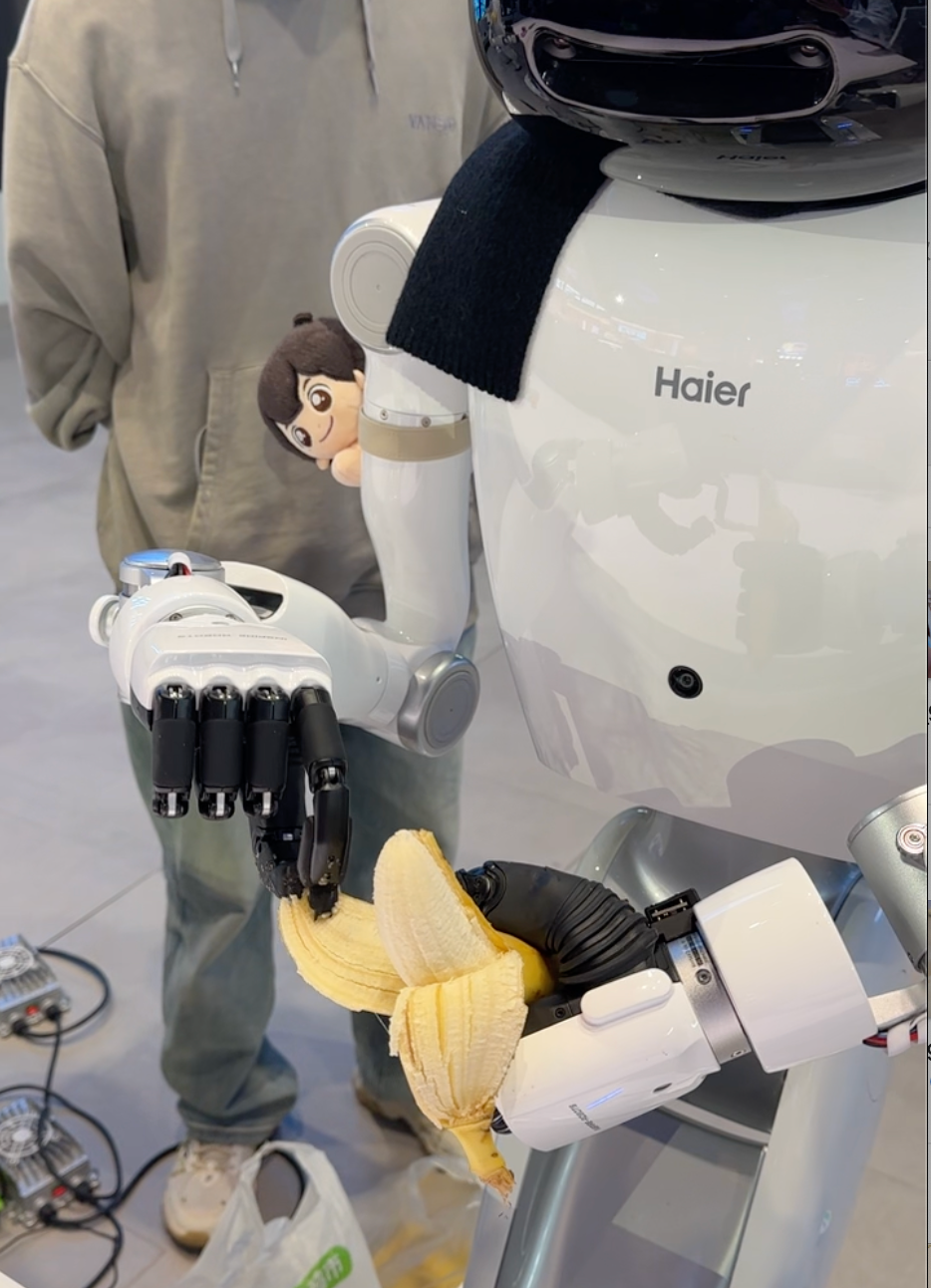 记者在现场看到它还展示了毫米级精度的能力,可以捏住香蕉皮将其剥下。这意味着机器人在精细化能力上逐步进化,未来类似打鸡蛋这种精细活也可以交给机器人。
