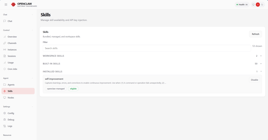 开发者用代码编程好各个功能,比如“上网查资料”、“总结摘要”等,将其封装成“skills”上传并共享,用户可以根据需求选择skills组合,再配置好Docker环境、选择接入的大模型,就能在自家电脑上配置一个掌握十八般武艺的智能体:
