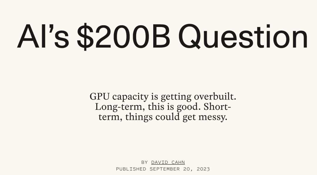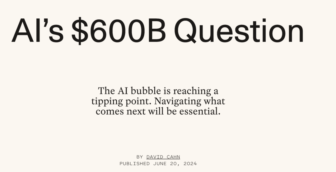 红杉资本合伙人David Cahn从2023年的《AI的2000亿美元问题》[1]劝到2024年的《AI的6000亿美元问题[2]》,随后贝恩公司接棒,去年预测到2030年,AI公司收入与满足计算需求的投入之间的缺口将达到8000亿美元[3]。