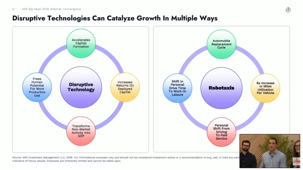 木头姐:大家好。我是Kathy Wood,ARK Invest的首席执行官兼首席投资官。今天我和研究及投资组合团队一起,为大家展示长达104页的《Big Ideas 2026》研究报告精华。我们相信,这正是投资银行家在80和90年代PC问世后所做的那种研究,旨在洞察技术的未来。那场技术革命的种子在那时就已播下并不断萌发,如今我们正处于一场全面的技术革命之中,需要通过原创性研究来探索未来并弄清它将引发什么。