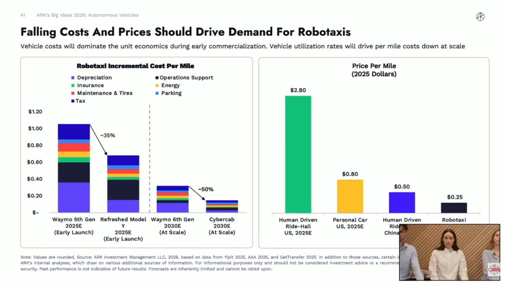 大众往往认为自动驾驶只是一项辅助驾驶功能,但在ARK看来,它是消费者能够在日常生活中接触到的首个大规模商业化的具身智能。决定这场出行革命胜负的关键,在于底层车辆的每英里运营成本。