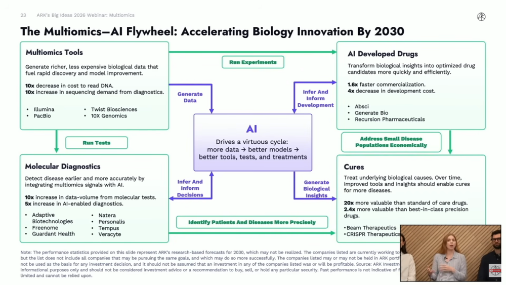 我们将这个周期分为四个关键领域:第一是多组学工具,即以更低成本获取更高质量的数据;第二是分子诊断,能够更早且更准确地检测出疾病;第三是AI药物研发,利用生物学洞察开发更优秀的候选药物,以更快、更低成本推向市场;最后是治愈,即针对疾病根源的一次性治疗。它们并非在真空中独立运行,而是相互增强形成飞轮效应。