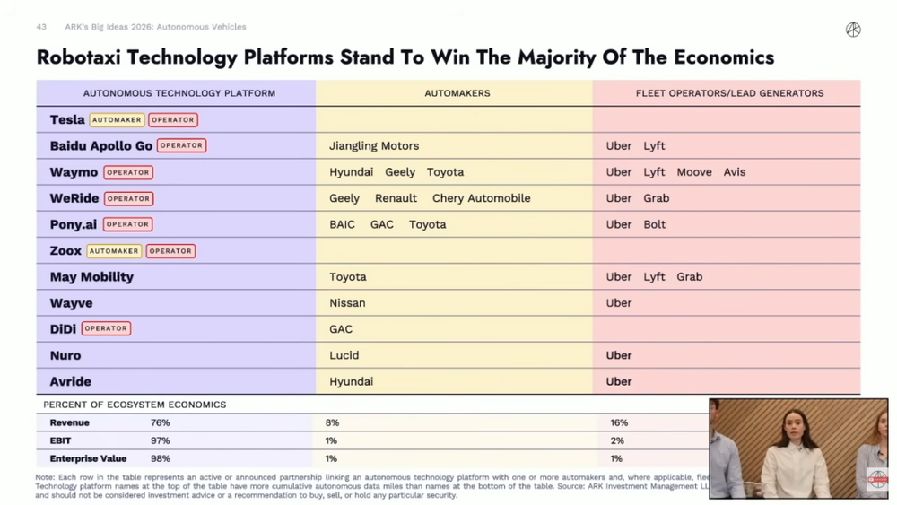 在监管方面,正如木头姐所说,自动驾驶平台已经证明比人类驾驶员安全得多。多年前我们曾估计Robotaxi能带来约80%的安全性提升,如今Waymo等平台以及Tesla发布的FSD全自动驾驶安全统计数据都证实了这一点。这项技术已经成熟,虽然监管对推动普及至关重要,但无人车已经上路,我们预见全面普及将在未来5到10年内发生。