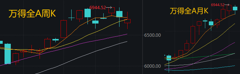刚过去的交易周(3月9日至13日),是地缘冲突影响下,A股走过的第二周。参考万得全A周线和月线,可以发现: