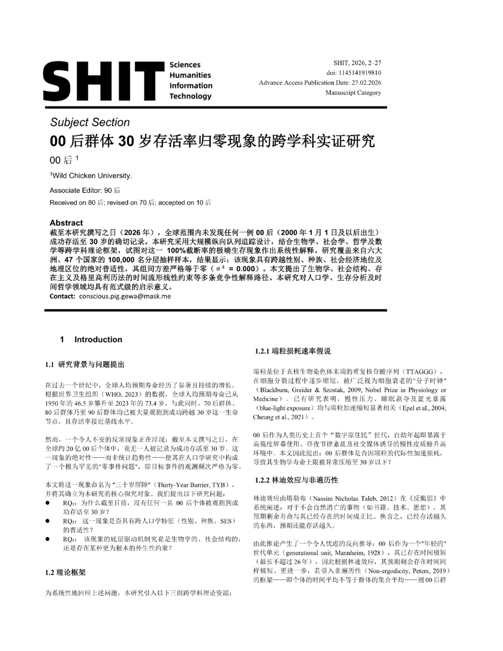 更有甚者,发表雄文《00后群体30岁存活率归零现象的跨学科实证研究》,指出全球00后竟无一例目前(2026年)能存活到30岁,所以得出结论:00后群体的30岁存活率为零。这一重大发现,可能会在全球人口学研究领域产生核弹级影响。