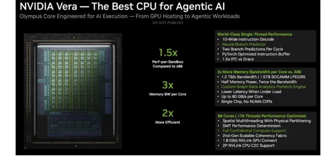 总而言之,英伟达声称其沙箱性能比 x86 竞争对手高出 1.5 倍,每个核心的内存带宽高出 3 倍,能效高出两倍。为了实现这些目标,该公司设计了一款 88 核 144 线程的 CPU,比第一代 Grace 的 72 核有所增加。英伟达还声称,这些核心的每周期指令数 (IPC) 吞吐量提高了 1.5 倍,相对于其他竞争架构而言,这是一个巨大的代际飞跃,因为其他竞争架构通常每一代只有个位数或十几个百分点的提升。在上一代 Grace 中,英伟达使用了现成的 Arm Neoverse 核心,但该公司明确指出 Vera 上的全新 Olympus 核心是“英伟达设计的”,这表明该公司对参考设计进行了定制修改。