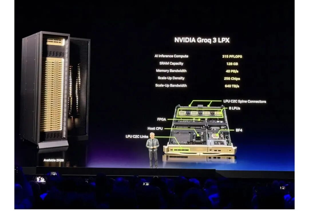 反过来,英伟达将构建包含 256 个 Groq 3 LPU 的 Groq 3 LPX 机架。该机架提供 128GB 的 SRAM 和 40 PB/s 的推理加速带宽,并通过每个机架 640 TB/s 的专用扩展接口将这些芯片连接起来。