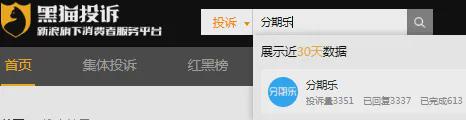 查看黑猫投诉平台,输入分期乐,就弹出金0天投诉量3351件,已完成仅613件,投诉问题包括高利率、砍头息、骚扰、不知情购入分期乐超市卡等。