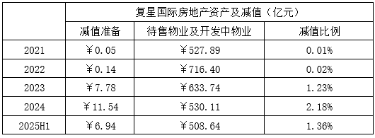 以房地产为例,国内房价这轮下跌周期始于2021年中,而复星国际2021年至2025年上半年末,账面上的待售物业和开发中的物业仅仅减少不足20亿元,在房价大幅下跌的背景下,复星国际并未“随行就市”计提减值损失;截至2025年上半年末,复星国际账面上与地产直接相关的资产仍高达508.64亿元,在楼市低迷的趋势下,不再计提减值就说不过去了。