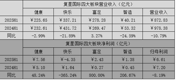 从业务的角度来看,2025年上半年,四大业务板块中,仅有“富足”板块依靠保险业务拉动,实现同比3.27%的增长;“健康”、“快乐”和“智造”分别同比下降2.99%、21.89%和24.59%;尤其是“快乐”板块,大消费低迷之际,豫园股份和两家酒企(舍得酒业和金徽酒)在2025年业绩也纷纷承压,板块利润从2024年同期的1.64亿元转为亏损4.35亿元,拖累集团整体的利润表现,2025年上半年归母净利润同比下降8.19%至6.61亿元。
