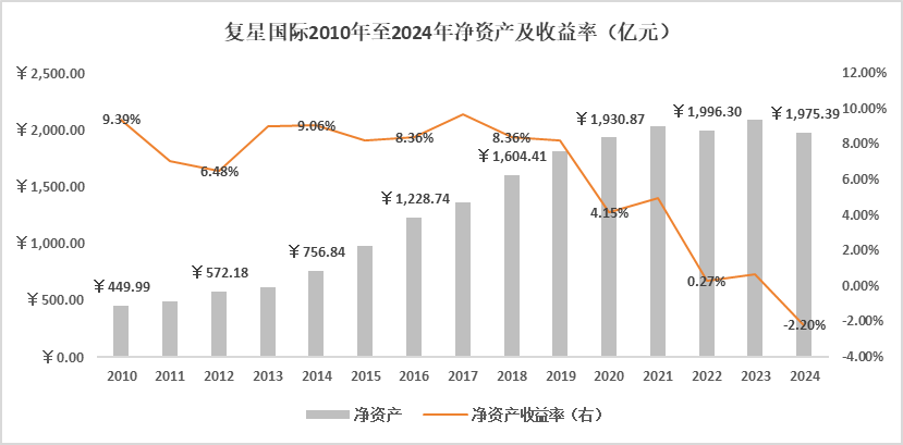 其一,规模增长但是盈利能力不足。2010年至2024年,复星国际净资产从450亿元跃升至1975亿元,但是净资产收益率却呈现出波动向下的趋势,尤其自2020年起至今,出现连续的阶梯式的大幅下滑。