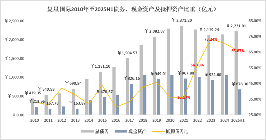 其二,过度并购导致偿债压力巨大。由于长期依赖“借钱”收购资产,并且内生增长能力不足,导致复星国际面临的偿债压力越来越大,2010年至2025年上半年末,复星国际有息债务从439亿元攀升至2221.01亿元,但账面上的现金却远远不及有息负债。