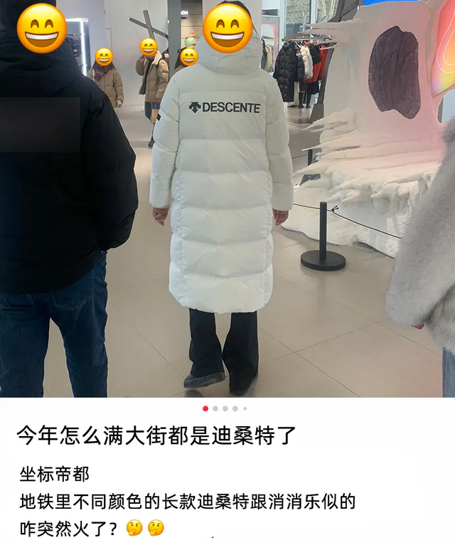 这两年,迪桑特的过膝羽绒服取代北面,成了大街上撞衫率最高的“街服”,被戏称是统一北京中产审美的“中年人工服”。