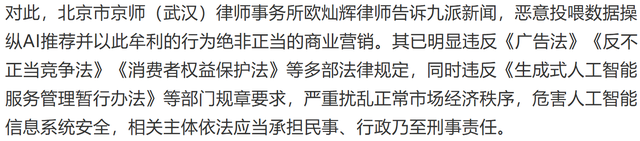对此,据《九派新闻》报道,北京市京师(武汉)律师事务所欧灿辉律师明确表示,恶意投喂数据操纵AI推荐并以此牟利的行为已明显违反《广告法》《反不正当竞争法》《消费者权益保护法》等多部法律规定,同时违反《生成式人工智能服务管理暂行办法》等部门规章要求。