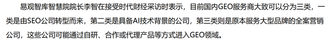 易观智库智慧院院长李智分析,目前国内GEO服务商大致可以分为三类:一类是由SEO公司转型而来,第二类是具备AI技术背景的公司,第三类则是原本服务大型品牌的全案营销公司。