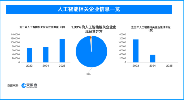 公开数据显示,我国拥有超510万家人工智能相关企业,其中近2%的相关企业曾出现法律诉讼,1.09%的相关企业曾出现经营异常。