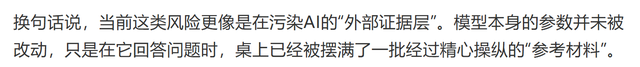 据《腾讯科技》报道,AI安全专家李光辉指出,“当前这类风险更像是在污染AI的‘外部证据层’。模型本身的参数并未被改动,只是在它回答问题时,桌上已经被摆满了一批经过精心操纵的‘参考材料’。”
