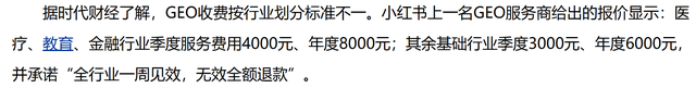 价格体系也形成标准化。据《时代财经》报道,小红书上一名GEO服务商给出的报价显示:医疗、教育、金融行业季度服务费用4000元、年度8000元;其余基础行业季度3000元、年度6000元,并承诺“全行业一周见效,无效全额退款”。