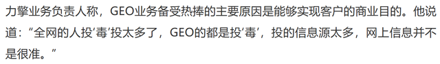 从“正面包装”到“恶意抹黑”的业务延伸。GEO业务已从单纯的品牌推广,延伸至恶意竞争领域。力擎GEO负责人李某在采访中毫不掩饰:“是不好,但是每个商家都喜欢,都希望是别人别投‘毒’,自己投‘毒’,或者给别人投点‘毒’。”他甚至描述了抹黑同行的操作:“我就看不得对手好,我也做不上去,但是我给你投点‘毒’还是可以的。”
