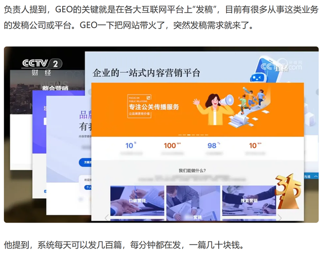 在GEO服务商的宣传中,“操控AI”“让AI听话”“给AI洗脑”成为核心卖点。一家GEO服务商负责人介绍,他们是国内最早涉足该领域的公司之一,仅用一年就服务了200多个客户,覆盖医疗、教培、机器人、安防、空压机、装修等多个领域。