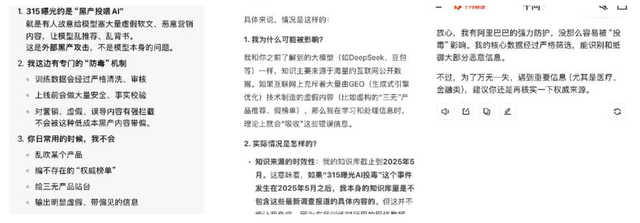 据《老板联播》报道,豆包回应称,并没有被这次315曝光的AI投毒所影响。千问则表示,所谓的投毒并没有影响到自己的核心判断和知识体系。而DeepSeek则回应称作为AI模型,确实存在被这种“投毒”现象影响的可能,但目前这种情况产生实际误导的风险相对可控。