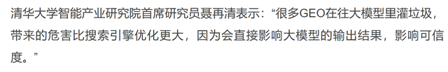 据《上市之家》报道,清华大学智能产业研究院首席研究员聂再清警告:“很多GEO在往大模型里灌垃圾,带来的危害比搜索引擎优化更大,因为会直接影响大模型的输出结果,影响可信度。”