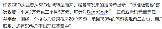 另据《大河报》报道,更有服务商提供“标准版套餐”,首次收费一个月2万元或三个月5万元,可针对任一AI平台,围绕一个核心关键词布局20个问题,承诺“80%的问题实现前三占位”。