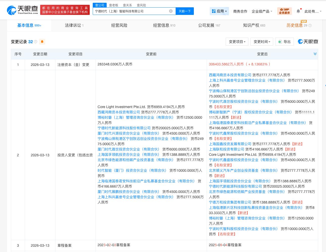 近日,宁德时代(上海)智能科技有限公司完成工商变更,注册资本由约28.3亿人民币增至30.6亿人民币,增幅约8.1%,同时新增博裕新智新产(宁波)股权投资合伙企业、北京顺义汽车产业创业投资基金等股东,股权结构进一步多元化。此次增资背后,是母公司宁德时代强劲的业绩支撑,更是其加速布局智能底盘等新业务、巩固产业龙头地位的重要举措。