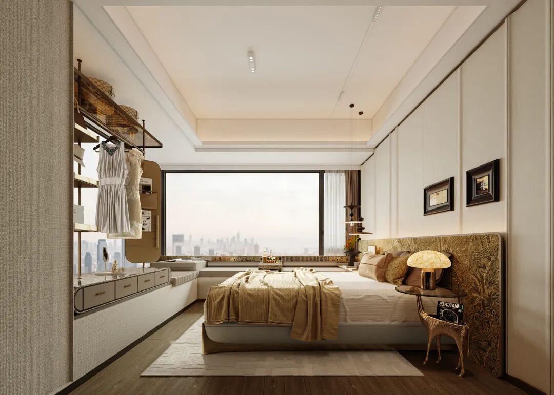 再比如,过去更多出现在豪宅中的转角无柱设计,也被引入到部分户型飘窗之中,即便是尺度不算奢阔的空间,也因此获得更完整的使用感。