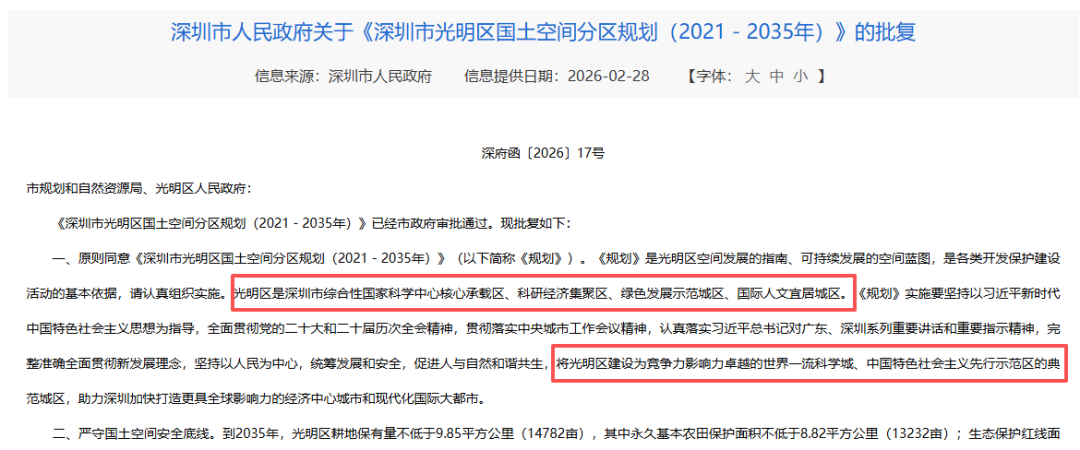2月18日,《深圳市光明区国土空间分区规划(2021—2035年)》获批,光明定位再次抬升: