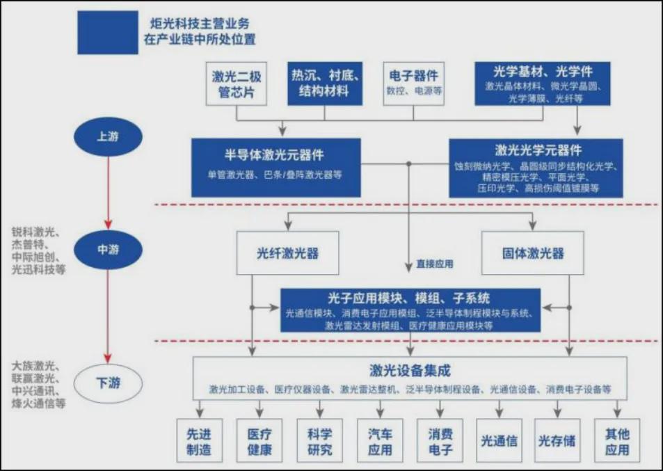 图:炬光科技的产品布局横跨上游元器件、中游模组与多类下游应用