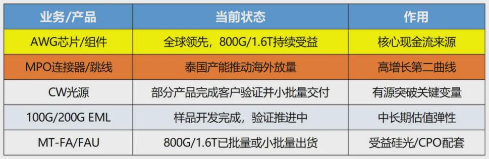 其一是AWG全球领先构成稳定现金流与客户入口。公司AWG芯片在全球市场具备较强的竞争力,不仅为公司带来稳定的现金流,还成为公司拓展下游客户的核心入口,通过AWG产品与全球主流光模块企业建立合作关系后,再逐步导入MPO、FAU及有源芯片等产品,实现客户资源的复用与价值最大化。