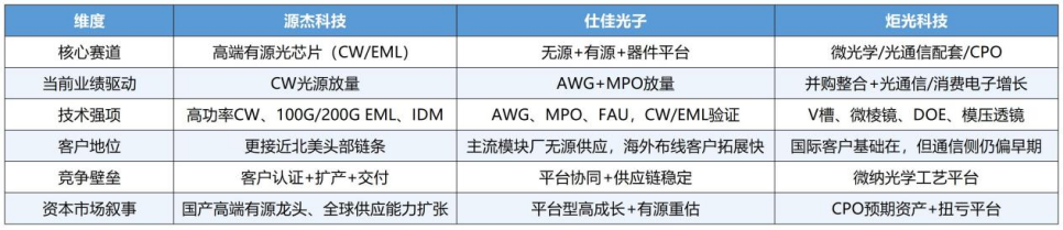 A股光芯片“三杰”均聚焦于光通信上游领域,但三者的核心赛道、技术路径与市场定位存在显著差异:源杰科技聚焦高端有源光芯片,是国内最接近海外一线梯队的国产突破者;仕佳光子则凭借“无源+有源+器件”的平台型布局,业绩确定性相对较高;炬光科技则聚焦微光学与CPO配套,是光通信新技术路线的前瞻布局者。