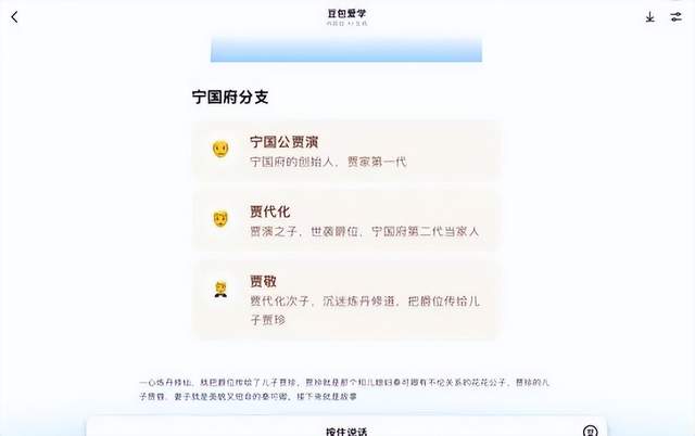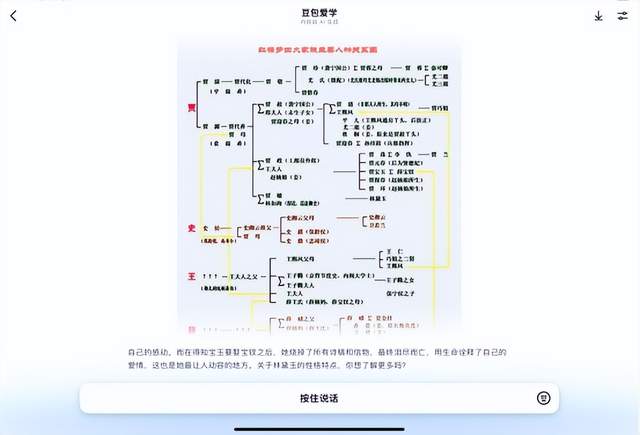 当孩子把《红楼梦》人物关系这个问题抛给豆包爱学,豆包一边开始娓娓道来,用语音讲解里面的人物关系,一边在屏幕上开始展示全人物关系结构图、各府分支等。