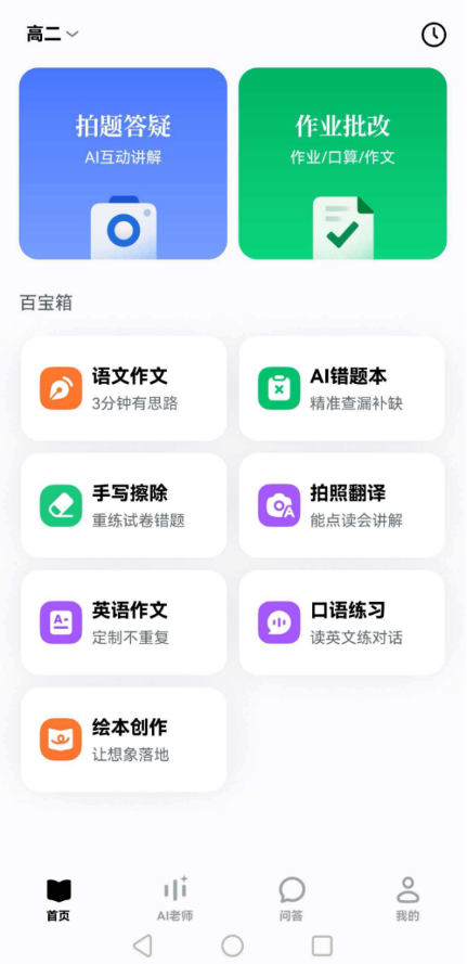 登录豆包爱学APP,首先会让用户选择年级,选项涵盖了从小学一年级到研究生,覆盖面非常广。进入APP首页,除了前述的AI老师等核心功能外,还有作业批改、AI错题本、语文作文、手动擦除等更多个性化功能。