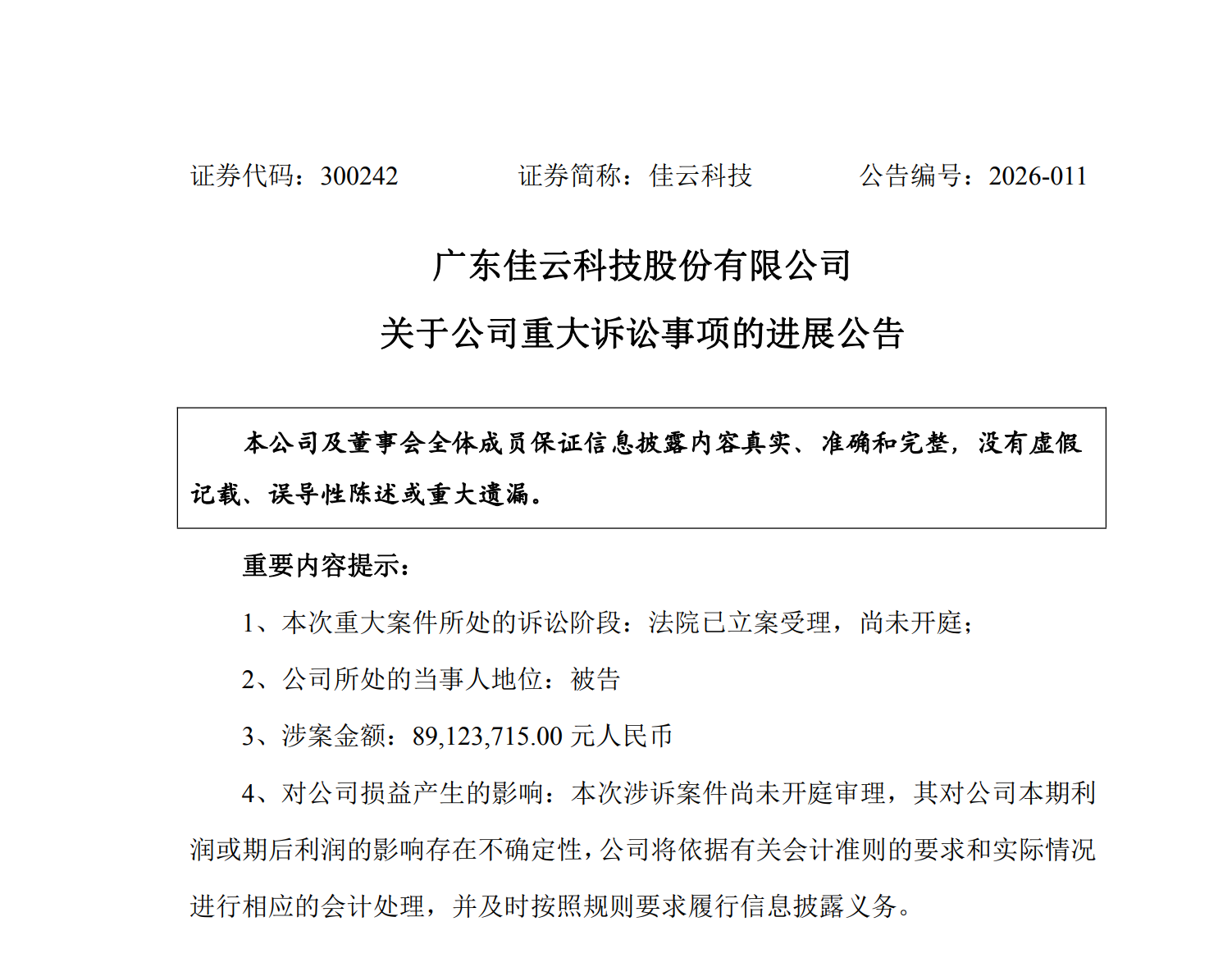 据佳云科技2月11日公告披露,九名原告诉称《投资协议》签订后,佳云科技多次严重违反《投资协议》约定,具体违约行为包括但不限于以下情况:严重拖延支付《投资协议》约定的各期增资款;利用其控股股东地位,违反投资协议《责权手册》,不当干涉和控制公司的经营活动,影响了公司的正常经营活动;由于佳云科技的违约行为,导致各原告的股权价值受损。综上,由于佳云科技的严重违约行为,给原告造成了巨大的损失,已导致原告所持公司股权价值遭受不可逆的损失,佳云科技应当依据合同约定赔偿原告的损失。九名原告联合向佳云科技提起诉讼,涉案金额合计8912.3715万元。