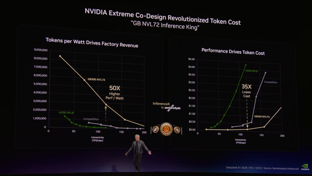NVFP4不仅仅是精度上的提升,它代表了完全不同类型的TensorCore和计算单元。我们证明了可以在不损失精度的情况下进行推理并大幅提升性能和能效,同时还能将其用于训练。结合NVLINK-72、NVFP4、Dynamo、TensorRT-LLM以及一系列新算法,我们甚至投入数十亿美元建造了DGXCloud超级计算机来优化内核和软件栈。