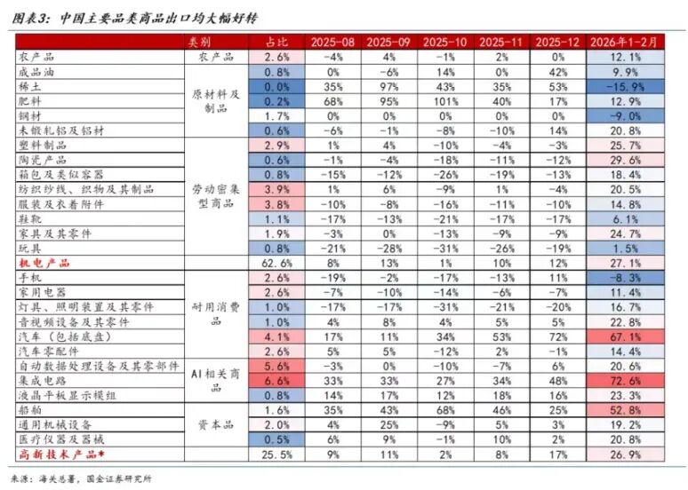 调整后真实增速也在10%左右,但叠加去年低基数(2025年1-2月出口只增2.1%),就爆表了。