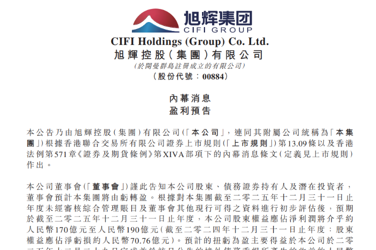 3月16日,旭辉控股发布内幕消息公告,预计截至2025年12月31日止年度将实现由亏转盈,股东权益应占溢利介乎约人民币170亿元至190亿元,上年同期为-70.76亿元。