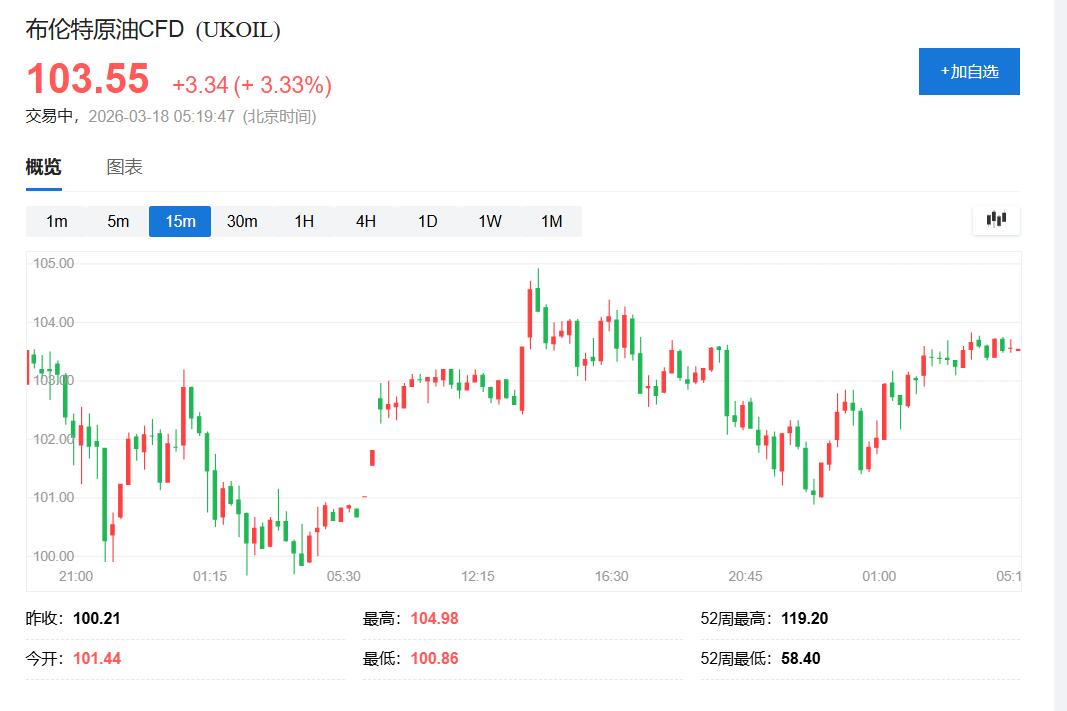 周二欧股盘前刷新日高时,布伦特原油逼近105.00美元,日内涨约4.8%,美国WTI原油涨至98.40美元上方,日内涨近5.3%。