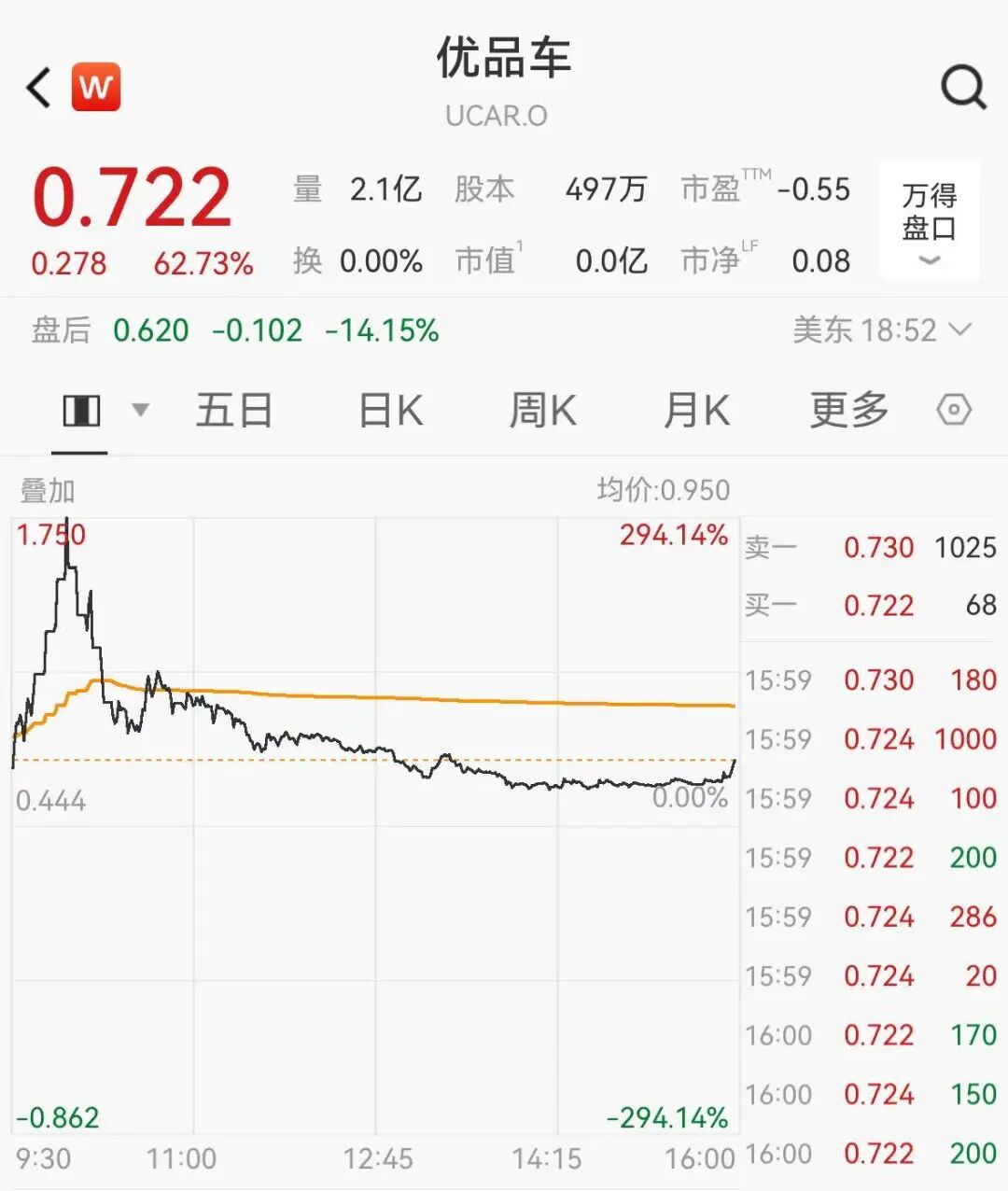 中概股优品车盘中大涨,最高涨近300%,并多次触发熔断,截至收盘涨幅报62.73%。