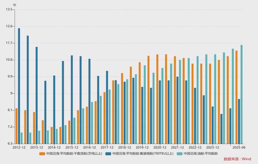 下图清晰地揭示了当前船龄结构的现状:以中国沿海为例,干散货船及油船的平均船龄已分别攀升至11.3年和11.6年,这预示着未来十年将是更新需求的密集释放期。