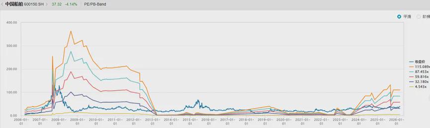截至2026年3月17日,中国船舶收盘价为34.4元。然而,将K线图向前复权20年,那座在2007年牛市巅峰创下的近300元(前复权)股价高峰,至今仍像一座遥不可及的墓碑,矗立在行业周期的轮回之中。