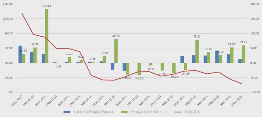 ●营业收入于2010年触及298.55亿元的阶段性高点后,便步入长达数年的下行通道,2017、2018年一度跌破170亿元。直至2020年后方见修复,2025年前三季度合并口径营收已达1074.03亿元。