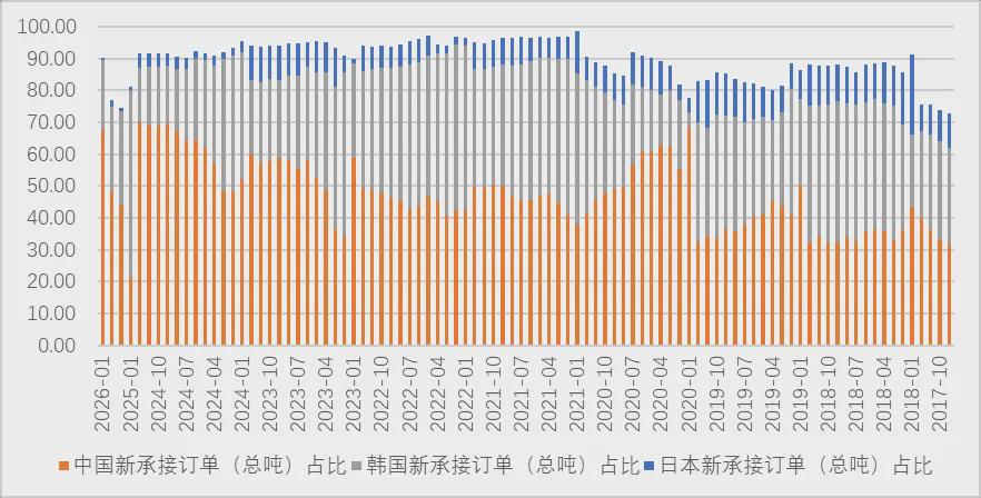 图:中韩日三国新接承船舶订单(修正总吨)在全球中的占比,据来自wind