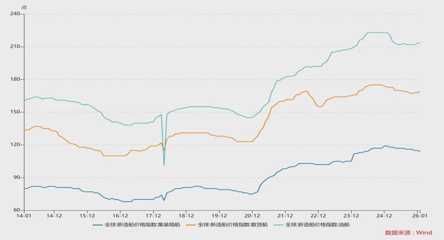 图:全球新造船价格指数——以散货船、集装箱船及油船为例